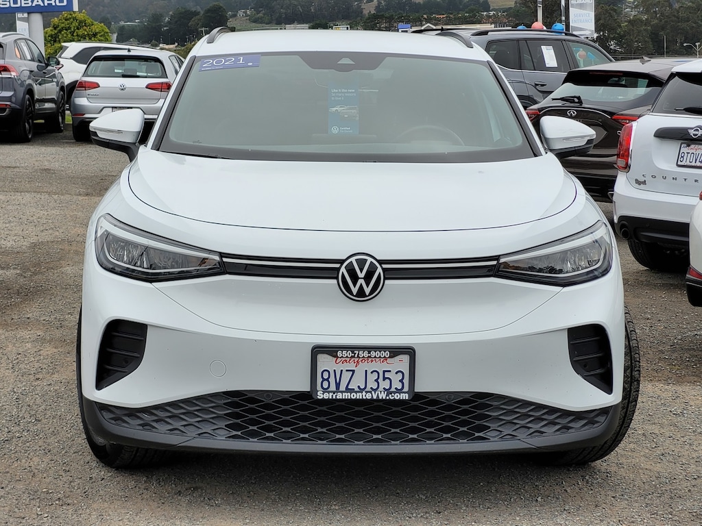 CARFAX One-Owner. Glacier White 2021 Volkswagen ID.4 Pro RWD Single-Speed Automatic Electric Motor 112 POINT INSPECTION, NAVIGATION, 4 Wheel Independent Suspension, 7 Speakers, ABS brakes, Air Conditioning, Alloy wheels, Auto High-beam Headlights, Auto-dimming Rear-View mirror, Automatic temperature control, Brake assist, Cloth Seating Surfaces, Delay-off headlights, Driver's Seat Mounted Armrest, Dual front impact airbags, Dual front side impact airbags, Electronic Stability Control, Emergency communication system: VW Car-Net services (capabilities require enrollment or subscription), EV Roadside Assistance Kit, Exterior Parking Camera Rear, First Aid Kit, Four wheel independent suspension, Frameless Auto-Dimming Rearview Mirror w/HomeLink, Front anti-roll bar, Front Bucket Seats, Front dual zone A/C, Fully automatic headlights, Heated door mirrors, Heated Front Seats, Heated front seats, Heated steering wheel, Heavy Duty Trunk Liner w/VW CarGo Blocks, ID.4 Protection Package, Low tire pressure warning, Navigation System, Occupant sensing airbag, Outside temperature display, Overhead airbag, Panic alarm, Power door mirrors, Power driver seat, Power passenger seat, Power steering, Power windows, Radio data system, Radio: Discover Pro w/10" Touchscreen Navigation, Rain sensing wipers, Rear anti-roll bar, Rear window defroster, Rear window wiper, Remote keyless entry, Rubber Mats Kit (Set of 4), Speed control, Speed-sensing steering, Split folding rear seat, Steering wheel mounted audio controls, Telescoping steering wheel, Tilt steering wheel, Traction control, Trip computer, Turn signal indicator mirrors, Variably intermittent wipers, Volkswagen Double Check (DISC), Wheels: 19" 5-Spoke 2-Tone Machined Alloy.
